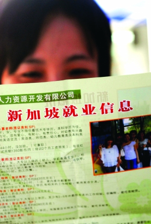 据该公司负责新加坡业务的主管陈洪妮介绍,有的非法中介人员就站在他们的招募摊点前散发宣传单,甚至还有人以上门求职咨询等方法,向该公司套取信息抢客户。“很多想出国打工的,根本进不了正规职场,在场外就被人截走了。”