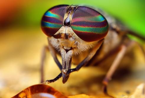苍蝇是大自然的清道夫之一,腐肉、腐烂水果和其他昆虫的粪便都是它们的食物。通常,它们使用特殊形态的吸管舐吮式口器,像吸管一样吸食腐烂的有机物,进食液态食物非常方便,可是固态食物呢?对于固态食物,苍蝇取食时会吐出嗉囊液来溶解食物,呕吐物含有唾液、酶结构和消化液,可以快速腐蚀苹果或腐烂的汉堡包。苍蝇在进餐同时也会吃进对自己不利的细菌,因此会边吐、边吃、边拉,这种方法有助于迅速排除细菌。一般苍蝇从进食处理、吸收养份一直到将废物排出体外只须7-11秒。