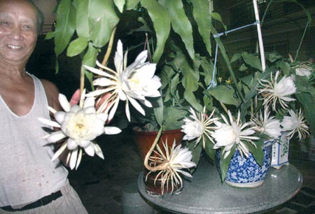 “这盆昙花前几年也就开放一两朵,属于典型的‘昙花一现’,可今年却不一样了,一下子开了九朵,好漂亮呀!而且这九朵昙华可谓竞相争艳,瞧!两天了,还没有萎缩,实在难得,往年晚上开花,第二天早晨天不亮就萎缩了,可今年不一样,实在奇怪……”昨日,张老爷子指着那9朵昙花惊奇地称。