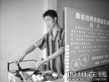 “我来自农村,身高1.79米,农村户口,人穷志不穷,面对新未来,我选择了自主创业,愿有志同道合之女友共同卖煎饼,开创人生新天地。要求:身高1.6米以上,高中以上学历,气质佳……”6日傍晚6点半,龚鸿把一块“真诚寻找创业女友”的红色征婚启事搁放在他的煎饼摊旁。