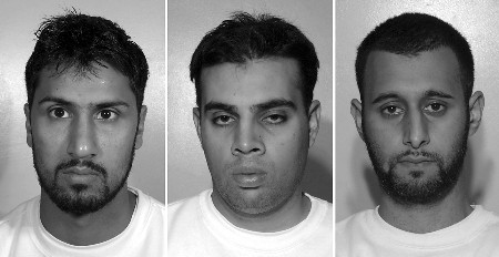 伍尔维奇刑事法庭认定,图谋炸机者分别是现年28岁的阿卜杜拉·艾哈迈德·阿里(左)、现年29岁的阿萨德·萨瓦尔(中)和现年28岁的坦维尔·侯赛因(右)。