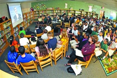 奥巴马在韦克菲尔德高中向全美中小学生发表新学期致辞 新华社发