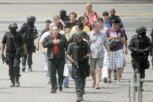 15时许,警方成功实施解救行动,警察押送8名男子从机舱内走出。其中一名遭拘捕男子身材高大,身着黄色衬衣,另一名遭拘捕男子穿白色衬衣。