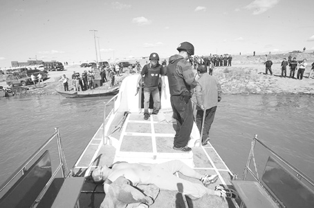 图为大庆警方将在水中被击毙的王厚军拉到船上。 (大庆市公安局供图)