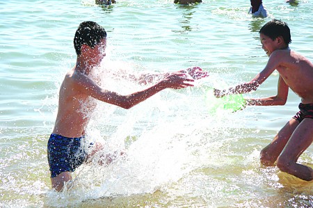 难得升温抓紧戏水 大众网-齐鲁晚报 2009.09.1406:36 关注 13日,在第一海水浴场,来自济南的两名儿童在海水中尽情地玩耍起来。当日,岛城气温比前几天略有回升,来海边的人也多了起来。据了解,9月下旬各浴场就将关闭,不少市民和游客赶在关闭之前再畅游一回。 本报记者杨宁摄