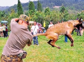 中午1时30分,昆明市警犬基地的4条比利时马犬依次登台,听着训犬师的口令作出相应的反应,随行走、正面坐、过障碍物跑,博得了市民的阵阵掌声。有市民自告奋勇率狗上前表演,但始终没有经过正规训练,才几个回合就不听使唤了。主人感慨狗狗经常关在家里,没见过大场面因此有些害羞,毕竟从来没有在这么多狗观众面前献艺。
