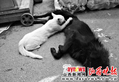 俗话说,猫狗是冤家,猫一见了狗就跑,狗一见了猫就追。可在太原市晋祠路河西农副产品市场里,这句老话却不怎么灵验了。同是一个主人的一只猫和一只狗,不仅变成了同吃同睡的好朋友,而且猫竟然爬到刚当了“妈妈”的小狗肚子上,大大方方地吃起狗奶来。