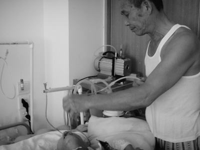 把软管小心地放进病人的喉部,然后启动真空泵,十几秒就完成了一次吸痰。张祥福每天都要用这部自制的“吸痰器”给老伴吸痰。