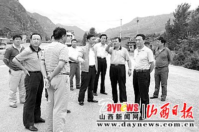 马走线K194——K216路段位于灵丘县唐河峡谷,路段临河傍崖,弯道陡坡急弯多,公路路面出现大面积龟网裂、坑槽等病害,部分路段路面严重沉陷、变形、推移,“三天一小堵,五天一大堵”一度是人们对这条路的真实描述,成为灵丘人民的头疼路,招商引资的瓶颈路。自从该段路面改造工程开工以来得到了县委县政府的广泛关注和大力支持,给工程顺利开展奠定了良好的基础。图为县委县政府四套班子领导在施工现场了解工程进展情况。