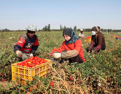 9月10日,新疆生产建设兵团十二师三坪农场来自喀什的工人在采摘西红柿。新疆生产建设兵团十二师三坪农场位于乌鲁木齐城郊,现有土地总面积10.4万亩,耕地面积8.4万亩。近年来,该农场通过推广新技术、新品种,提高农作物的品质,增加了农场职工的收入。新华社记者 赵戈 摄