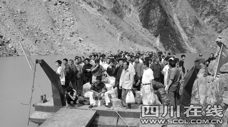 小岗剑山下,就是一个巨大的堰塞湖。现在,群众上下山,必须要从堰塞湖上泛舟。在现场,武警某水电部队的一艘大铁船行驶在堰塞湖上,船上载着很多被困下山的群众。船靠近下山的岸边后,官兵逐一将乡亲扶下船。