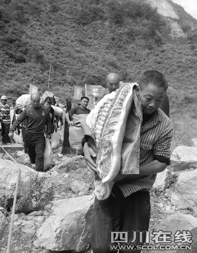 一些群众坐船出山,还有一些群众要坐船进山。不同的是,进山的人都背着大米、清油、蔬菜等一些吃的和药品。在他们中间,我们看到了很多熟悉的面孔,清平乡党委副书记刘如松、政府工作人员袁文珂、棋盘村村上的陈德安等,还有穿着警服的乡派出所干警等都加入到搬运蔬菜、食品和药品的队伍中。武警水电部队的官兵也帮着群众搬运物资上船。