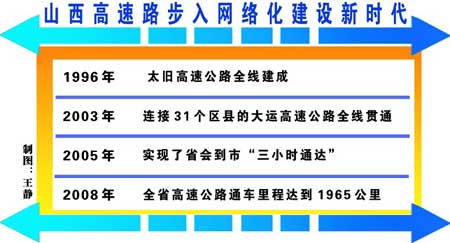 2008年底,晋城至济源、运城南环高速相继建成运营,全省高速公路通车里程达到1965公里,一个以太原为中心,覆盖全省、地市互通、北出长城、南抵黄河、东联京冀、西达秦蜀的高速公路网初具规模,路网效应逐步显现,为山西经济社会发展、新型能源和工业基地建设,提供了良好的交通环境,发挥了有力的支撑保障服务作用。