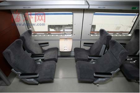 一等座车厢更为宽敞,大客室48座,小客室24座,一等座车厢的座位有脚踏,可调节。