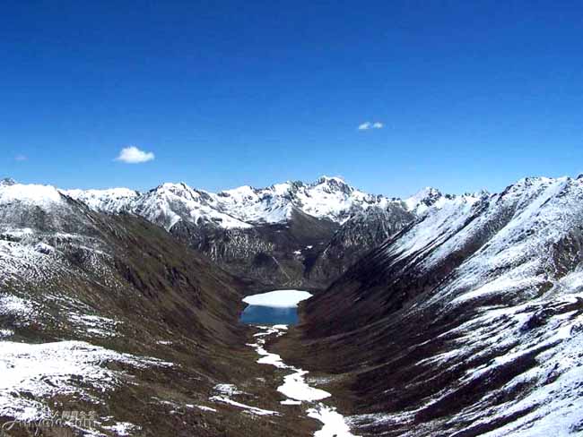我们满怀着虔诚开始往圣湖方向行进,经过50多公里的山间小路后到达了崔久乡一村。这是一个幽雅宁静的小村庄,和内地相比只是缺少了人气,各色顽强生长的小草在村子周围小块土地里展现。高原山村的早晨醒得有些迟缓,凫凫炊烟在屋头升起,屋角周围隐隐绰绰有人活动的影子。周围山峰都朝着北方,据说是向圣湖表达膜拜之意。在河谷两侧的山顶上,有两座宝瓶型的岩石,传说莲花生大师云游至此,为利乐众生,永保民众平安,他念了一道咒语后将其放在宝瓶里,并放置在旁边的高山顶上,这就是今天崔久的来历。