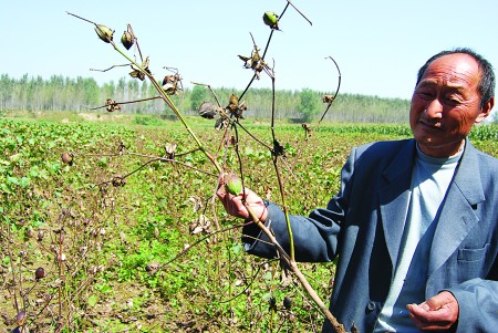 21日,记者赶到了司马镇杨马村跟随村民来到了棉花田里,在十余位村民的指引下,记者看到村边公路两侧的田地中,大面积的棉花产生枯萎、衰黄的性状,棉珠大多焦枯,叶子脱落仅剩叶脉。而棉桃在收获季节到来前便“争相开放”,但记者随手摘了几颗棉桃后发现,棉桃的棉子呈褐色。一位村民称,这种棉花根本不能卖,“正常的棉花是非常饱满的,而这种棉花即便能卖出去也无法卖出好价。”