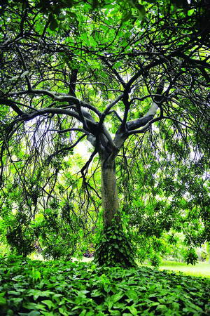 在植物园的百花厅中,有一棵高大的南洋楹,树冠达1000平方米以上,胸径1米以上,三四人才能合围起来。你别以为它是千年古树,其实还不到50年。