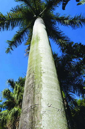 植物园的几十株大王椰子,树干高大挺直,如排列整齐的柱子笔直伸向天空,远远望去犹如一排排面向蓝天整装待发的导弹,这里常常被人戏称为“导弹基地”。