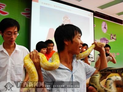 报告会现场大学生与罗丽莉宠物蛇亲密接触。广西新闻网实习生 余静摄