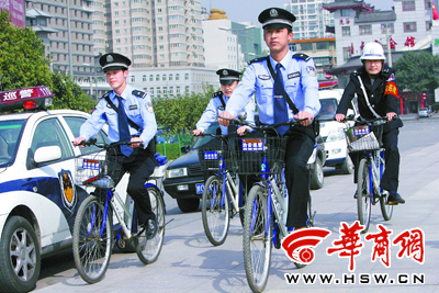 昨日下午3时,几名年轻英俊、骑着自行车行进在西影路上的巡警,吸引了不少市民的目光。为了响应无车日的倡议,昨日在大雁塔北广场和周边地段,西安市公安局雁塔分局的民警采取徒步、骑电瓶车和自行车的方式展开巡逻。