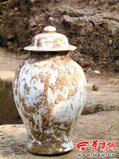 昨日记者发现,白釉陶瓷的“将军罐”上残存着尘土,但却依然光亮,没有损坏。