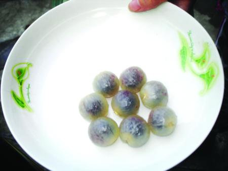 剥壳后,带有淡淡紫红色血丝的果肉呈现出来。