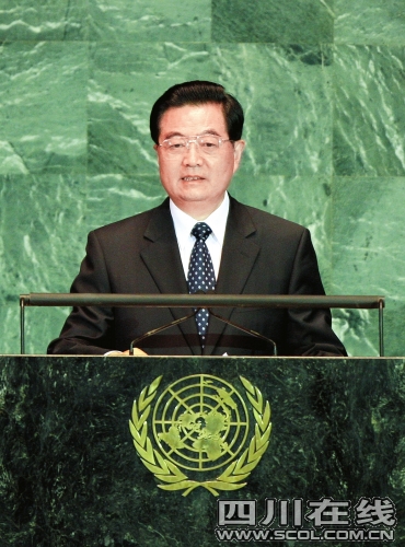 当地时间16时30分许,在热烈的掌声中,胡锦涛登上联合国庄严的讲台,发表题为《同舟共济共创未来》的重要讲话。胡锦涛在讲话中强调,中国的前途命运日益紧密地同世界的前途命运联系在一起。中国将始终不渝走和平发展道路,始终不渝奉行互利共赢的开放战略,坚持在和平共处五项原则的基础上同所有国家发展友好合作。中国越是发展,对世界的贡献就越大,给世界带来的机遇也越大。中国过去、现在、将来都是维护世界和平、促进共同发展的积极力量。