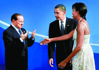 不久后,就轮到奥巴马吃醋了。当意大利总理贝卢斯科尼看到米歇尔后,他立刻满脸含笑地张开双臂,试图给她一个热情的熊抱。然而让老贝尴尬的是,尽管他保持张开双臂的动作长达数秒钟,但米歇尔却仿佛“视而不见”,最后只伸出了一只手与他握手了事。照片显示,在整个过程中,站在一旁的奥巴马显然充满警惕,他斜着眼睛抛去冷冷一瞥,似乎提防老贝“图谋不轨”。