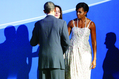 当晚,模特出身的法国总统萨科齐夫人布吕尼身穿一套墨蓝色紧身礼服,她一进场就艳惊四座。奥巴马显然被吸引,立即走上前与布吕尼拥抱,并在布吕尼的两侧脸颊各亲吻两次,并对她说:“今天可能没有足够的时间和你聊了。”然而由于拥吻的时间太长,他身旁的夫人米歇尔只好在一旁茫然若失地等待。照片显示,米歇尔当时满脸不悦而且神色紧张,仿佛打翻了醋坛子。