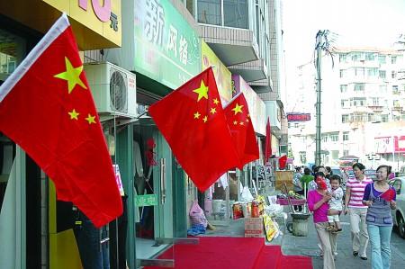 在烟台三站批发市场警务室,工作人员爬到屋顶悬挂国旗,他们说要把国旗挂得高高的,祝愿祖国更加繁荣富强。在塔山明珠的工地上,几十面国旗迎风飘扬。在东山街道办事处,一下子买了十面国旗的王先生说,国庆节期间要在家里挂几面,让几个子女家里也都挂国旗,共庆祖国60华诞。