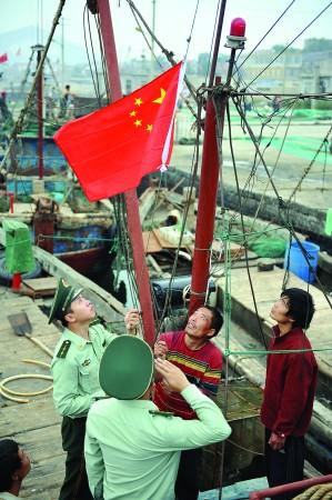 烟台山后初家边防派出所民警与辖区渔民共同升旗。
