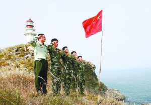 9月30日,驻守青岛海域小公岛、朝连岛等无人海岛的海警官兵向国旗敬礼。