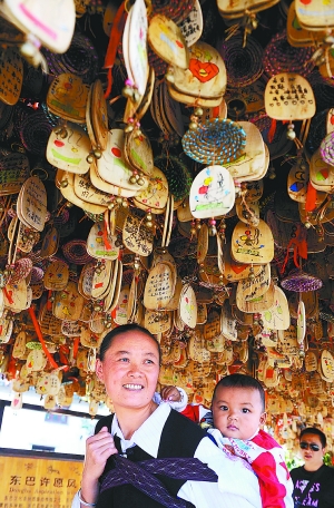 9月29日,一名纳西族妇女背着孩子在云南丽江古城的东巴许愿风铃下,这里被各地游客挂满了风铃。国庆长假将至,气候宜人、风光旖旎的云南丽江成为国内外游客理想的旅游目的地。