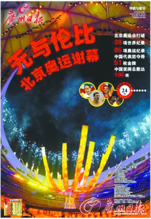 在北京奥运会报道战役中,广州日报报业集团奥运“兵团”凭借强大实力,强力策划、强势出击,为读者打造“抢眼”饕餮资讯大宴;最强大的团队阵容,除了后方编辑部强力支持,更将奥运编辑部全线前移京城,并以强大的印刷能力,独占亚洲报业鳌头,每小时654万对开张印力,用最短的时间印刷海量信息。奥运会开幕日208版倾情演绎,引领厚报潮流,再次重现1997年香港回归时万众排队抢购《广州日报》的风云传奇。