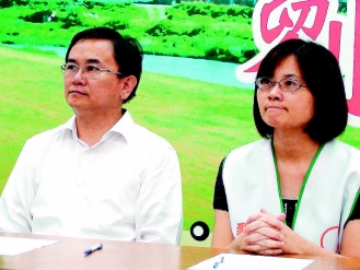 前台东县副县长刘棹豪(左)昨天下午偕妻子宣布投入年底台东县长选战。