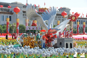 10月2日上午10时,北京天安门广场,在国庆60周年群众游行中精彩亮相的“锦绣中华”彩车方阵已移至此,供首都群众和各地游客参观。