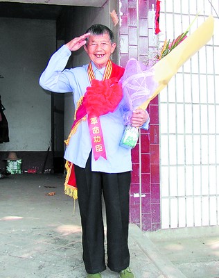 身披绶带,手捧鲜花,胸挂纪念章,张平汉站在自家门前,向祖国敬了一个标准的军礼。
