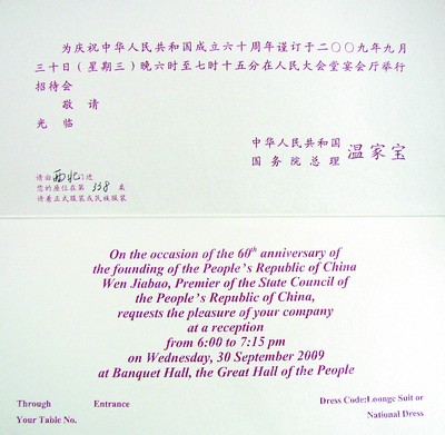 打开这张中英文对照的精美请柬,几行金色的大字映入了张老的眼帘:为庆祝中华人民共和国成立六十周年谨订于二00九年九月三十日(星期三)晚六时至七时十五分在人民大会堂宴会厅举行招待会。敬请光临。落款是“中华人民共和国国务院总理温家宝”。