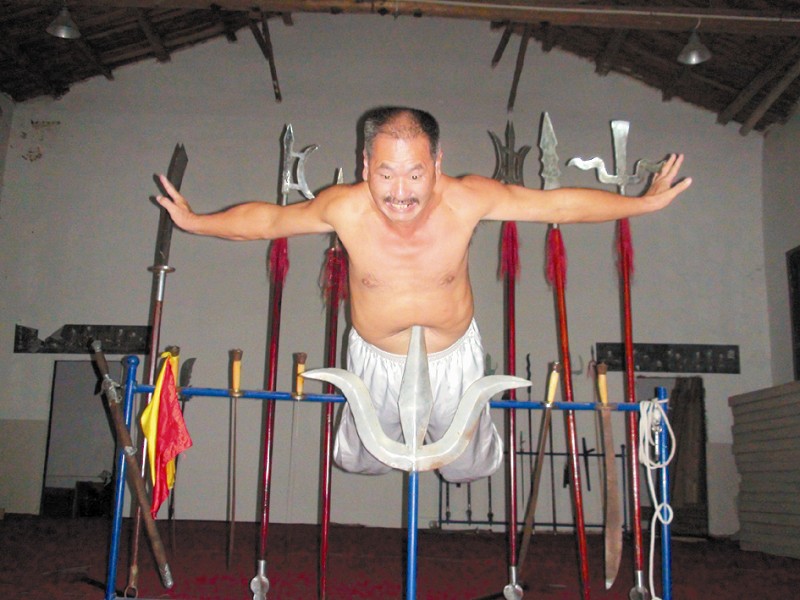 腹部以锋利的钢叉作为唯一支点,将整个人顶起。昨日,永春县白鹤拳拳师颜大石的表演,让人佩服不已。今年已经60岁的颜大石习武40多年了,白鹤拳日臻成熟,其内功可“锤砸头顶砖”,亦可“背躺钢刀腹插钢钉”。(提醒:专业动作,切勿模仿!)