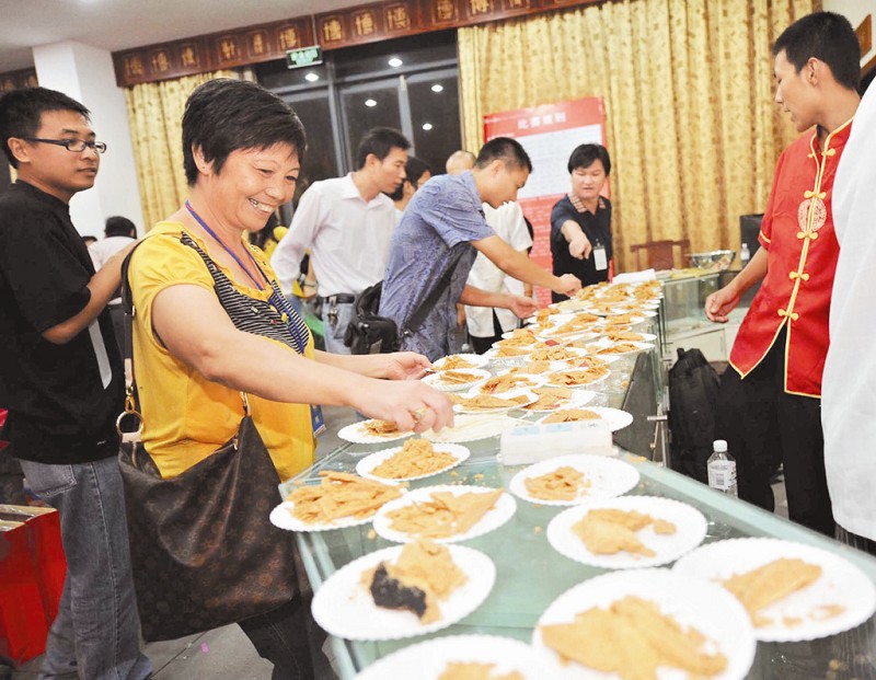 昨晚那颗66斤重的超级贡糖骰子吸引了无数人的眼球。当这颗特别的贡糖被切开当做点心供在场众人品尝,其甜而不腻的口感也颇得好评。不过,负责切贡糖的两位师傅可就辛苦了。只见刀影翻飞,一盘盘大小适中的贡糖就被切了出来。不过,众人吃了一轮又一轮,师傅们切了一刀又一刀,一个小时下来,这颗贡糖骰子却还有一大半“巍然矗立”。切贡糖的师傅忍不住感叹:“我原来以为是空心的,没想到是这么真心实意!”