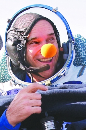 作为加拿大太阳马戏团创始人,拉利伯特戏称自己是“太空第一小丑”。在国际空间站逗留、观光期间,他干起杂技演员老本行,戴上小丑“红鼻子”道具,在零重力状态下与自己的孩子视频通话。