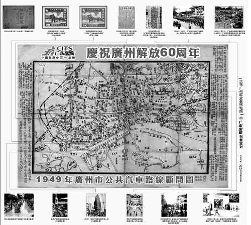 新快报讯 (记者 陈琦钿 通讯员 劳毅波 钟山)有什么简便方法可以直观了解广州60年城市的巨变?看地图吧!今日(13)起,5万份《庆祝广州解放史照地图》新鲜出炉,市民们可以到指定的广东国旅各连锁店免费索取。这套地图以“三江五彩石印厂”套红版印制的——“1949年广州市公共汽车路线顾问图”为本图,加放了13张当年广州庆祝解放的史料照片,并在地图上用“红旗”图案,特别标注相关这些史料照片的具体位置,方便市民“按图索骥”。