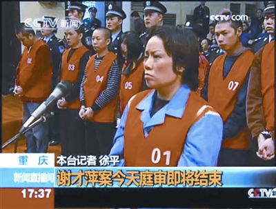 上午11时,审理谢才萍开始。从11时到中午12时26分休庭,再从下午1时30分,到下午1时55分,重庆“女黑老大”谢才萍在审判庭上公开开庭审理长达111分钟。