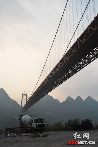 坝陵河大桥项目由贵州省桥梁工程总公司负责承建,该公司副经理黄盛向“全国网络媒体多彩贵州行”采访团介绍,全桥使用各类钢材约6.5万吨,浇筑混凝土约25万方,概算投资14.8亿元,为目前省内交通建设独立大桥投资之最。大桥于2005年4月18日开工,将力争于今年年底建成通车。
