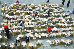 10月14日,被查扣的15万只假名表在集中清点。这些手表做工非常粗劣,被堆放在破烂的纸皮箱中,每一个纸皮箱里放着的就是同一款型号的手表,型号达几百种。当日,在佛山澜石码头,一批劳力士、雷达等“国际名表”藏匿在申报为纸巾、抛光砖等低值货物的三个货柜之中,企图蒙混过关发往非洲某国,结果被广州海关所辖佛山海关驻禅城办事处一举截获。这些手表包括了ROLEX、TISSOT、SWATCH、RADO、CASIO等近20个世界知名品牌。据悉,这是广州海关近年来查获侵权手表数量最多的一起案件,在国内亦属罕见。CFP供图
