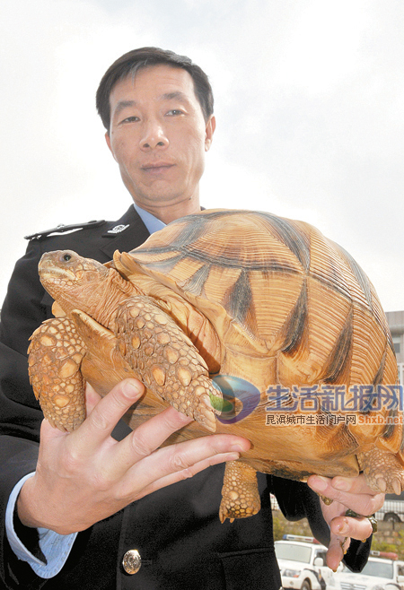 今年6月1日,市森林公安专案组在昆明机场查获了三只龟,一公二母。后经专家鉴定,这三只龟“身世显赫”,是世界十大濒危物种之一的马达加斯加安哥洛卡象龟,全世界不足1000只,我国还没有这种物种。犯罪嫌疑人落网后,经审问得知,原来这三只象龟从马达加斯加被贩卖到泰国后,又进入中国边境,嫌疑人准备将其带到北京,从中获取暴利。