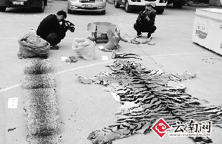 16. 8月30日 在昆明华洲大酒店侦破1起非法出售濒危野生动物印支虎制品案,查获印支虎皮1张,虎骨13公斤,总价值48万元,并先后抓获3名嫌疑人;