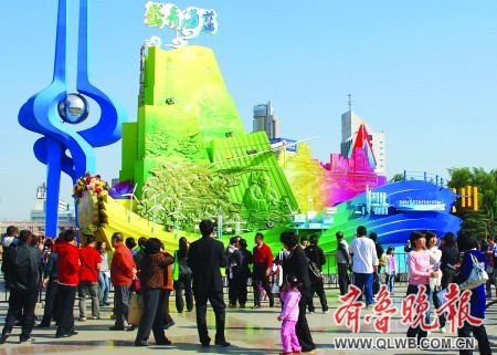 17日,在北京圆满参加完国庆60周年群众游行的“岱青海蓝”彩车亮相泉城广场,引来无数市民围观。实习生张晓鹏摄