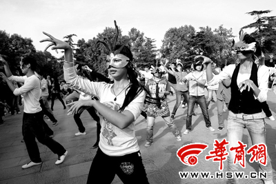本报讯(记者 卢红曼) 昨日下午2时30分,兴庆宫公园内,50多名年轻人戴着或恐怖、或可爱的面具,跳着“奇怪”的舞蹈,吸引了数百名游客围观。
