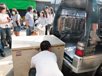 基隆检察官郑雅方(右三,手拿文件者)今早到资源回收场了解冰柜女尸案,葬仪社人员协助将置放尸体的冰柜抬上车,送至巿立殡仪馆相验。